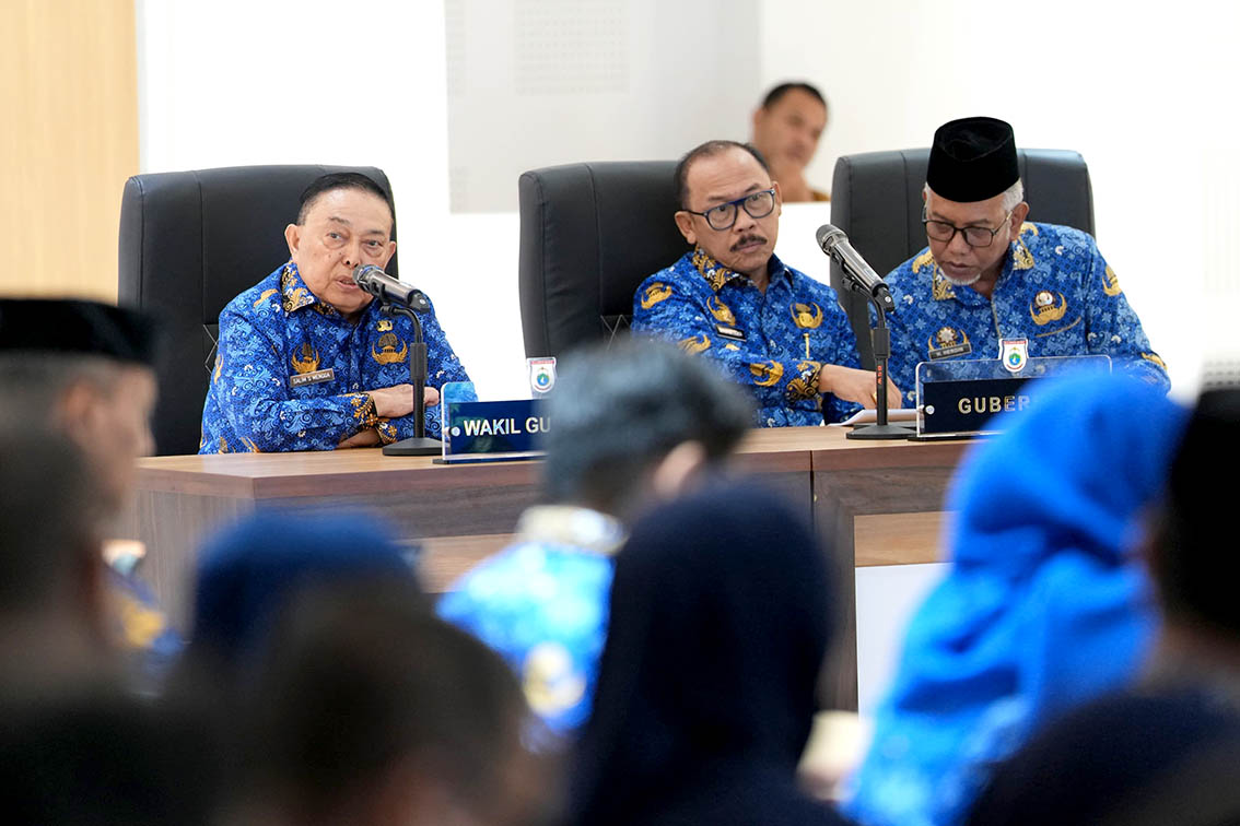 RAPAT: Gubernur Sulbar, Suhardi Duka (SDK) didampingi Wakil Gubernur Sulbar, Salim S Mengga dan Pelaksana Harian Sekretaris Provinsi Sulbar, Herdin Ismail, menggelar rapat pimpinan pembahasan dan penyampaian kesimpulan akhir tentang evaluasi kinerja pembangunan serta penjelasan alokasi anggaran penyesuaian terhadap Instruksi Presiden (Inpres) nomor 1 tahun 2025.