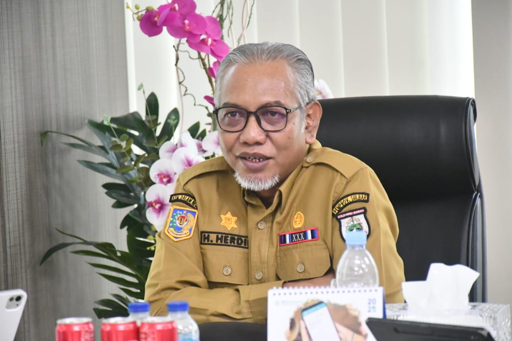 EKSPOSSULBAR.CO.ID, MAMUJU – Pelaksana harian (Plh) Sekprov Sulbar, Herdin Ismail memimpin rapat virtual bersama Sekretaris Daerah se-Sulbar di ruang kerjanya, Selasa 8 April 2025.