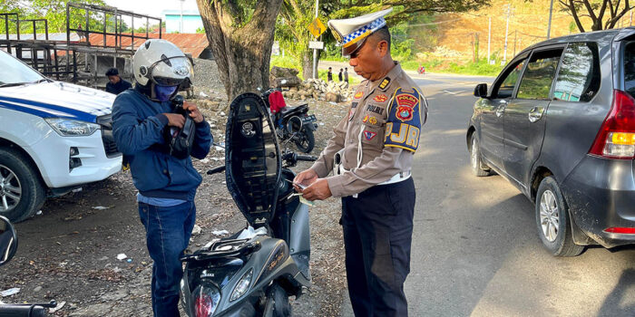 EKSPOSSULBAR.CO.ID, MAMUJU – Direktorat Lalu Lintas (Ditlantas) Polda Sulbar menggelar razia penegakan pelanggaran lalu lintas (Dakgar) secara rutin di jalur dua depan Kantor Passokorang, Kabupaten Mamuju, Selasa (29/4/2025).
